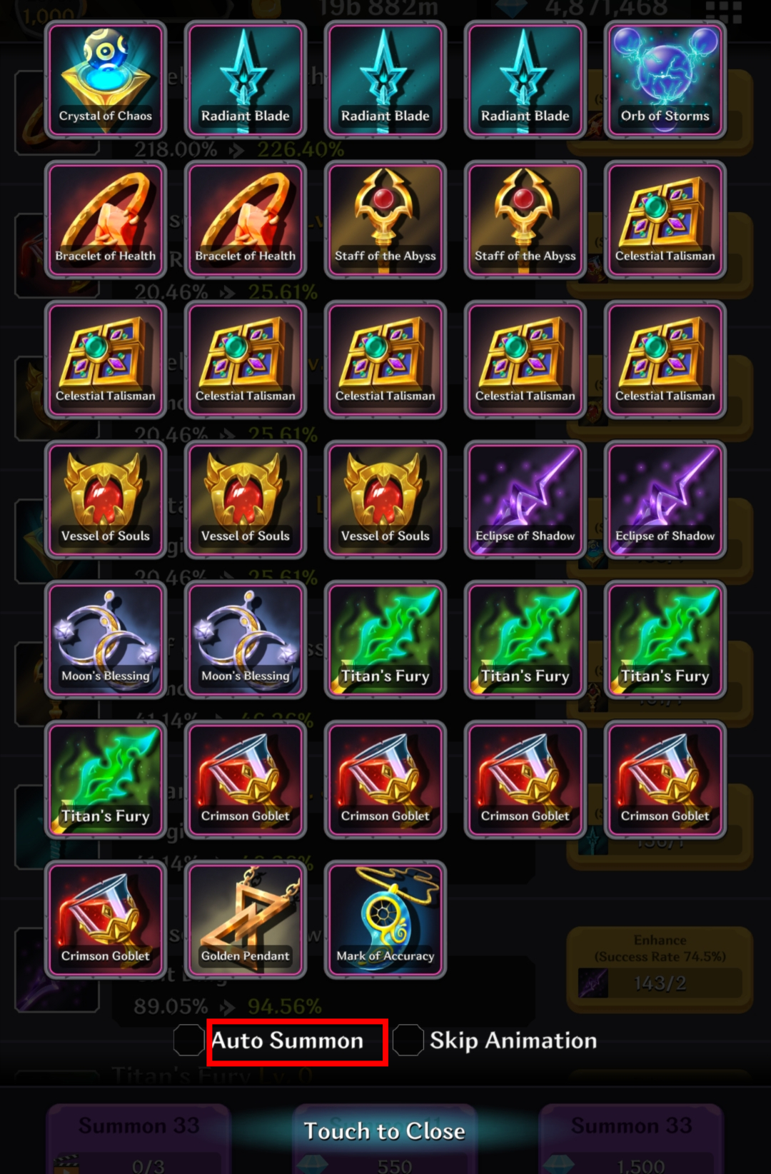 If auto-summon is enabled, artifacts will be summoned automatically until you touch the screen.