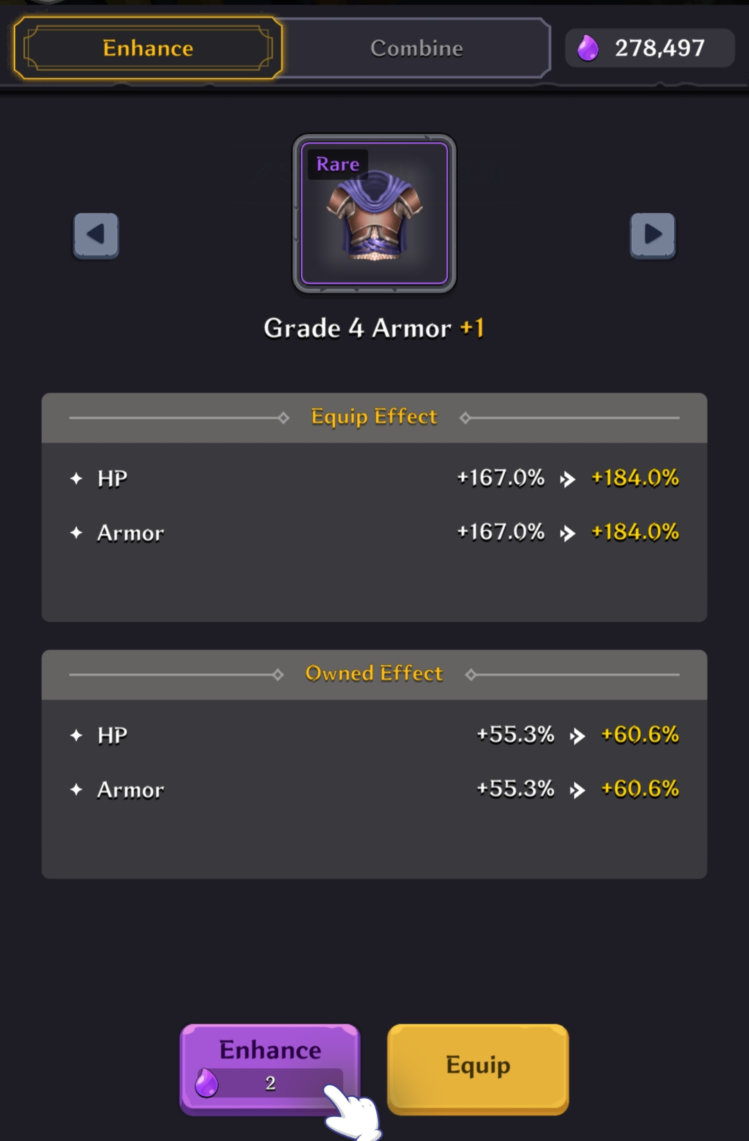 You can enhance equipment by pressing the [Enhance] button, consuming Elixirs. Long-press the button for continuous enhancement.