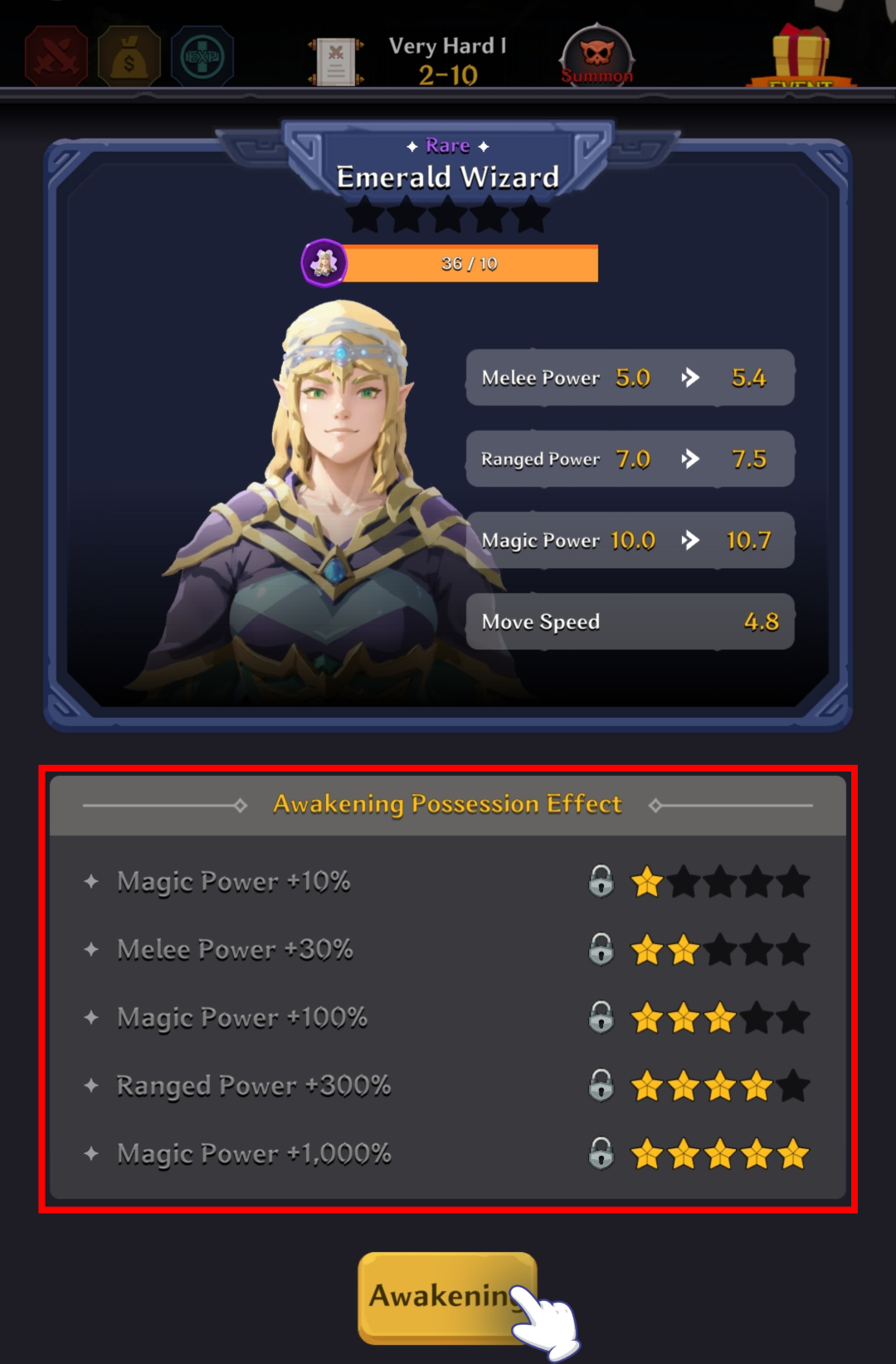 You can unlock awakening possession effects based on the number of awakening stars a character has.
